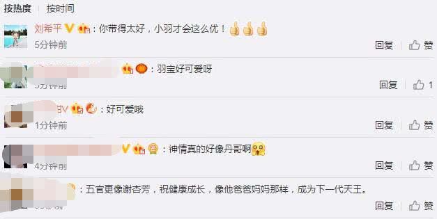 此外,也有网友评论:“羽宝好可爱呀,五官更像谢杏芳,祝健康成长,像他爸爸妈妈那样,成为下一代天王!”