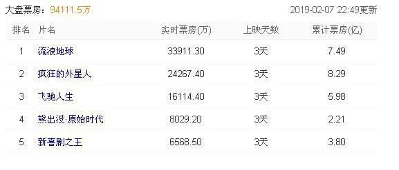 2月7日,上映三天的科幻电影《流浪地球》实现了票房逆袭,登顶春节单日票房冠军,累计票房截止到2月7日23:00为7.49亿,仅次于《疯狂的外星人》8.29亿。豆瓣评分8.1分。