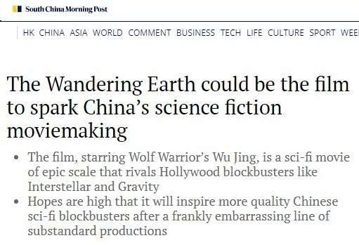 《南华早报》:评论《流浪地球》为史诗级科幻电影,这部由《战狼》中的吴京主演,是一部史诗级科幻电影,堪比《星际穿越》和《地心引力》等好莱坞大片。拯救人类的科幻故事,在好莱坞可以说已经被拍烂了,当中国人能拍好自己的科幻片时候,世界都会为之鼓掌。