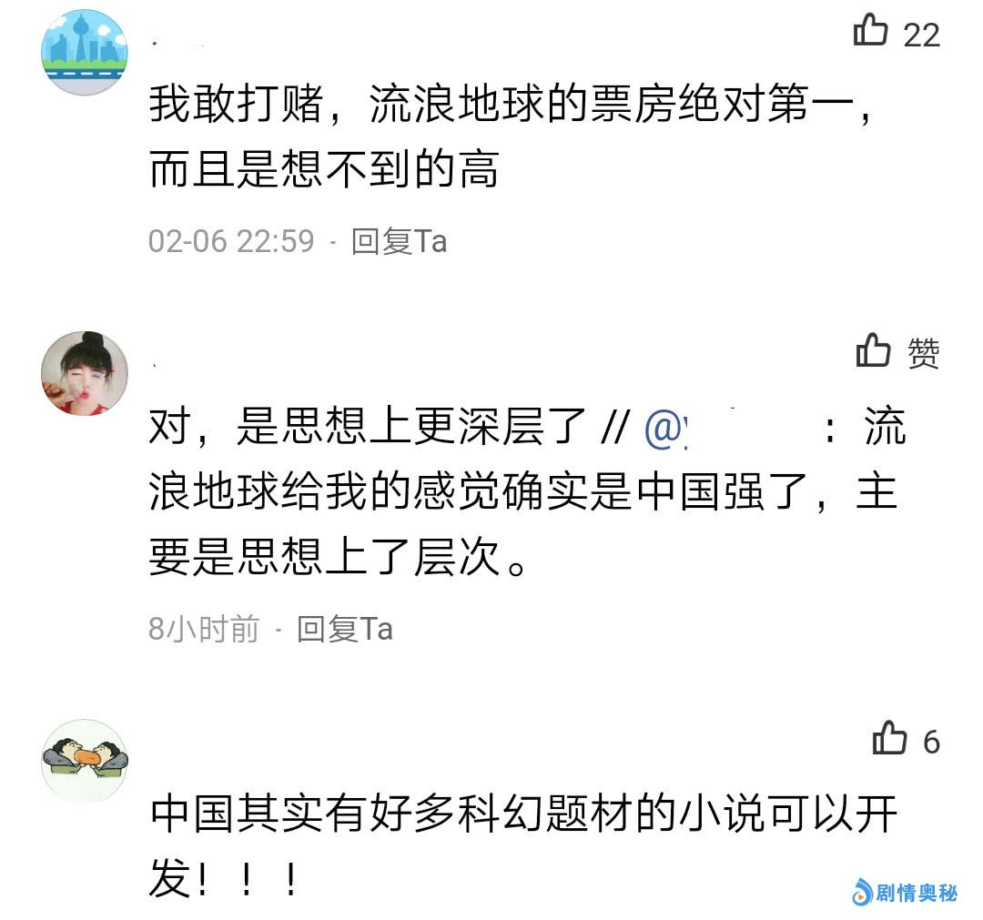 《流浪地球》在国外上映后,能否在好莱坞争到一席之地?观众口碑已经给了答案。有网友看过《流浪地球》后评价:“流浪地球给我的感觉是中国强了,主要是思想上了层次!”还有网友评论说:“流浪地球的票房会是第一,而且是想不到的高!”有的网友说:“去影院刷三遍。”