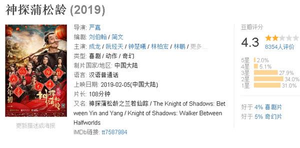 第八名:《神探蒲松龄》由成龙、阮经天、钟楚曦、林柏宏领衔主演的古装喜剧。(豆瓣评分4.3分)