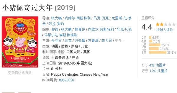 第七名:《小猪佩奇过大年》由张大鹏等执导的动画电影。(豆瓣评分4.4分)
