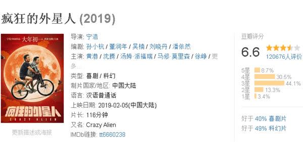 第三名:《疯狂的外星人》由黄渤、沈腾领衔主演的现代科幻影片。(豆瓣评分6.6分)