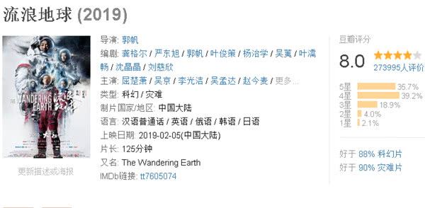 第一名:《流浪地球》由吴京特别出演,屈楚萧、李光洁、吴孟达、赵今麦领衔主演的科幻剧。(豆瓣评分8分)