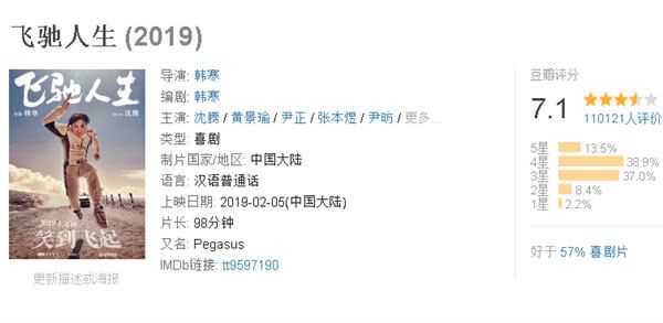 第二名:《飞驰人生》由沈腾、黄景瑜、尹正、尹昉等主演的喜剧片。(豆瓣评分7.1分)