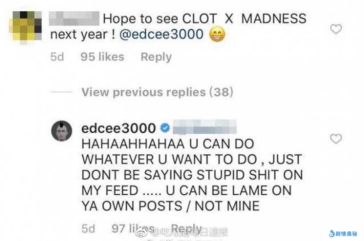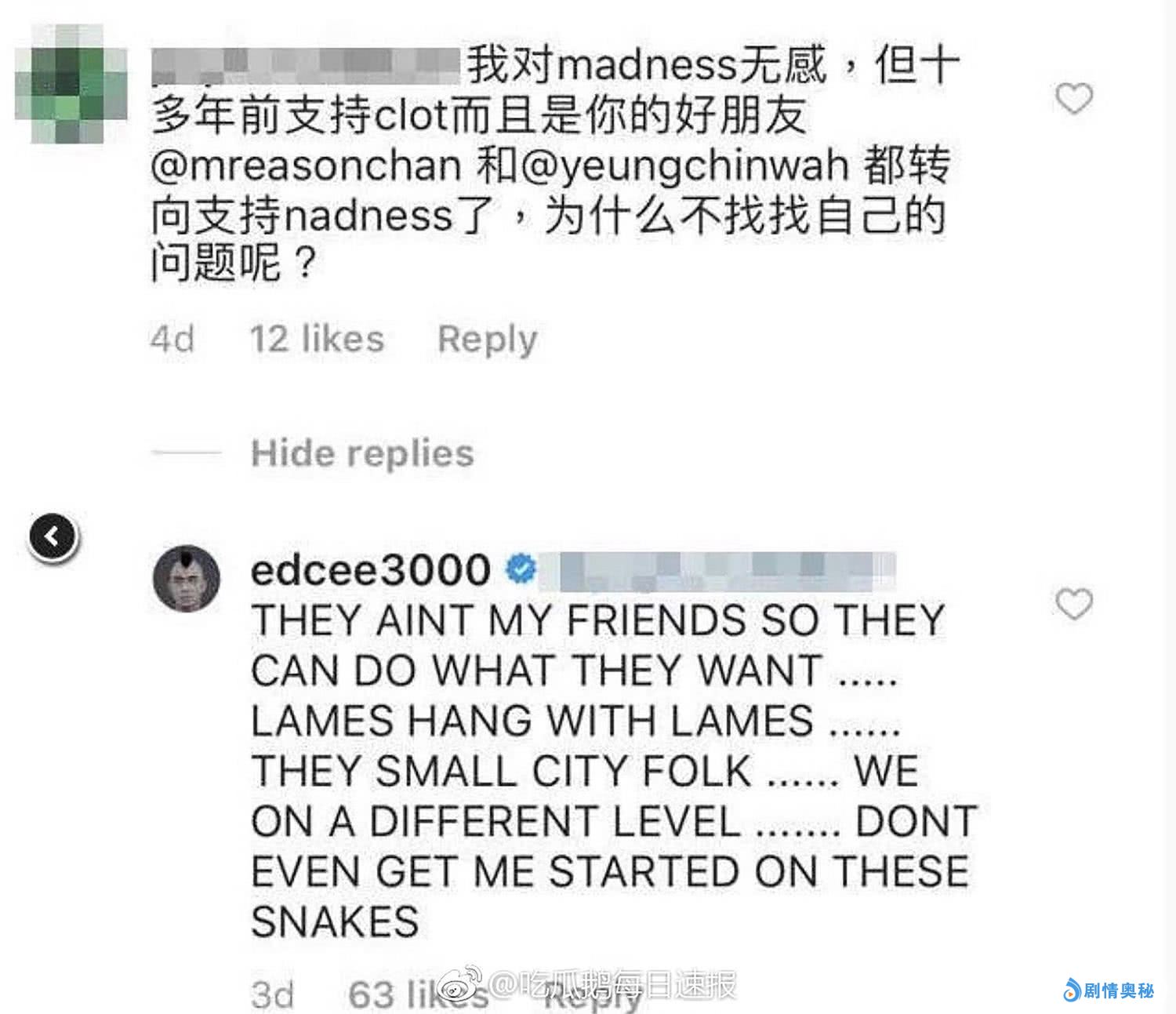 这也只是其中一件事情,而在两年前,又因为一件牛仔大衣,两个人又有了摩擦。陈冠希更是直接发文指余文乐品牌是“SADNESS”外,日前,他再次因为余文乐而怒怼网友,还说杨千嬅与陈奕迅不是他的朋友。