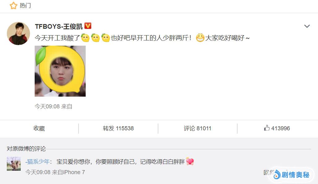 再说排名上升的王俊凯,今天上午小凯更新动态,他在个人主页写道:今天开工我酸了,也好吧,早开工的人少胖两斤,大家吃好喝好。据悉小凯正在拍摄的新剧是由陆川导演操刀的《749局》,这也是小凯出道以来主演的第一部电影,此前小凯完美演绎的网剧《天坑鹰猎》张保庆一角,相信他在《749局》里演绎的全新角色不会让“小螃蟹”失望。