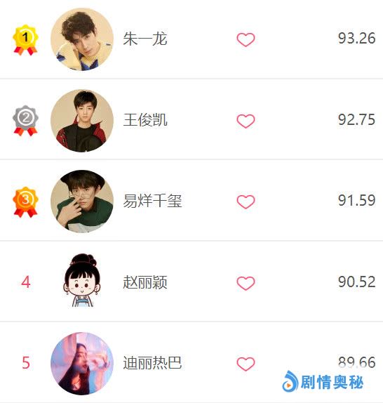 目前网络人气最旺的五位艺人依次是朱一龙、王俊凯、易烊千玺、赵丽颖、迪丽热巴,其中“小笼包”助朱一龙登顶,小凯颖宝紧随其后,易烊千玺稳居前三,被杂技演员夸赞的迪丽热巴位列第五。