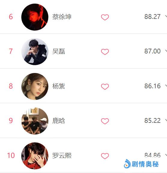 排在榜单后五名的娱乐圈明星依次是蔡徐坤、吴磊、杨紫、鹿晗、罗云熙,其中空降热搜的杨紫排名冲至第八位,正在全力以赴演绎《掮客》周小山一角的罗云熙稳居前十。以上便是最新一期娱乐圈明星人气榜的全部内容了,你愿意一直陪伴在谁的身边?