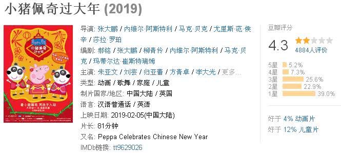 《小猪佩奇过大年》其实这部电影拍摄的挺好,之所以评分低,就在与真人和动画结合,因为小孩子只想看动画,大人演的他们看不懂,很多小孩子在观看此影片时候,有个有趣现象就是,放动画片时候都很安静,一到放真人演绎电影时候就哭闹,甚至有的小朋友认为大人演的是广告。而大人们看这部电影,觉得就是两人小孩子在吵闹,幼稚,没有什么可看。