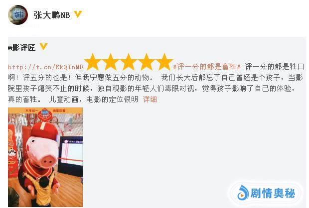 今天该片导演张大鹏在社交媒体上发声,转发一条为电影《小猪佩奇过大年》打出5星满分的影评,而这条动态则鲜明的表达了对该片的支持态度:“评一分的都是牲口啊!评五分的也是!但我宁愿做五分的动物。”发布这条动态的网友,其实说的是有一定道理,但是把观众比喻为动物,有点不恰当,花钱看电影,还被骂,你说冤不冤?难道只因给“此”电影评分太低?