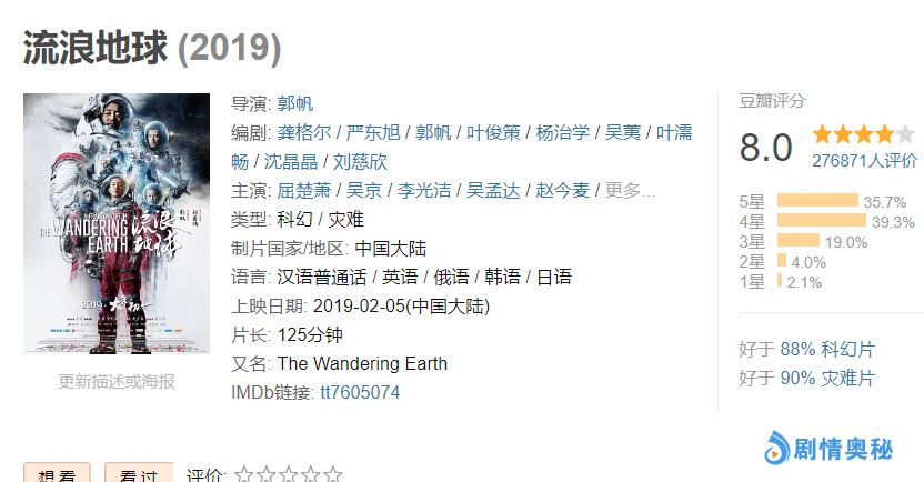 但是,与这种突飞猛进的势头成反比的是,《流浪地球》的口碑持续下降,豆瓣评分由最初的8.4分,降到了8.0分,1星占比率由原来了1.8%升到了2.1%。当然了,豆瓣评分并不能决定什么,而且评分人数由10万人飙升到了近30万人,基数的不断增大,直接影响了总分的高低。
