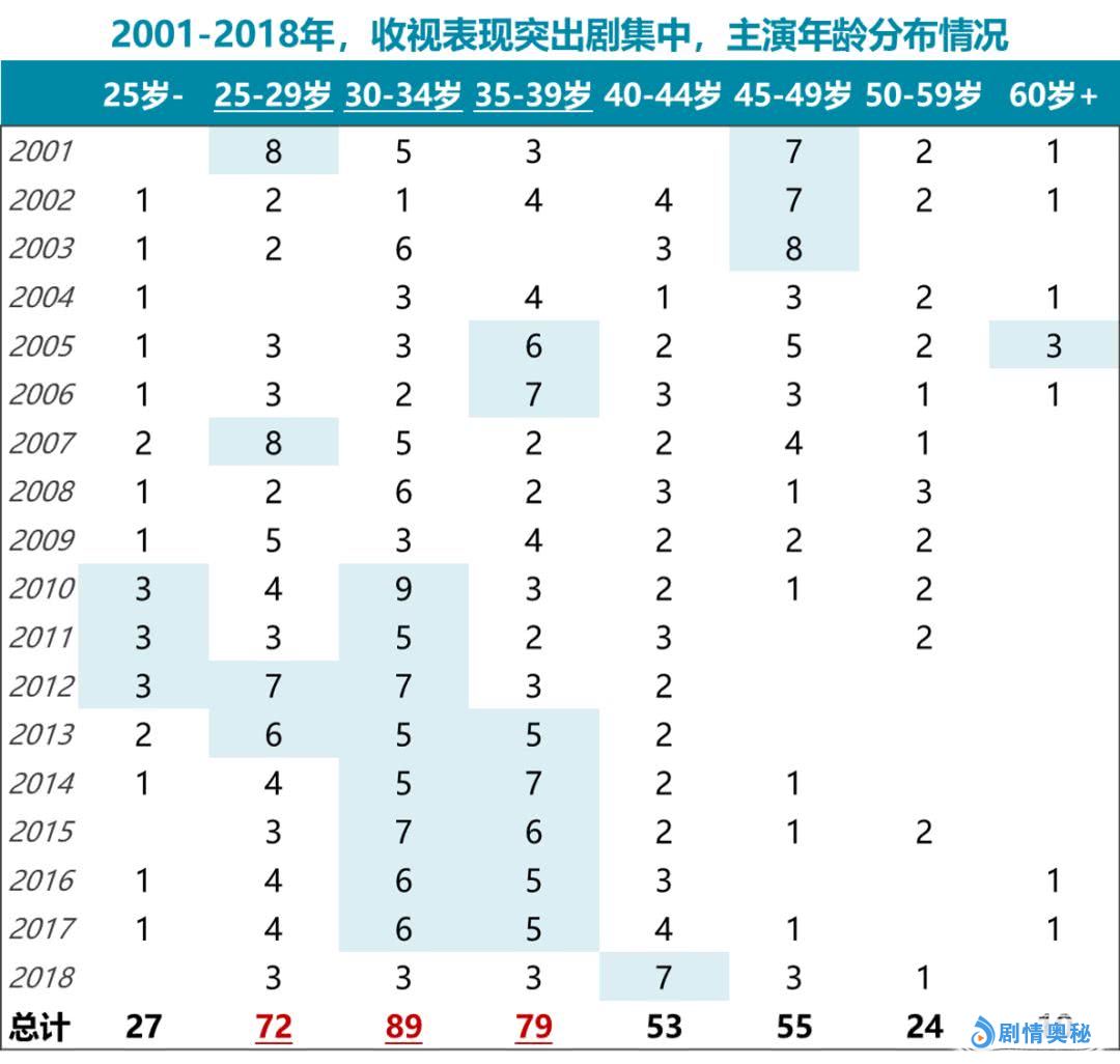 下图为2001年至今,收视率表现突出的电视剧里,主演年龄区间分布趋势。在所有年龄段的演员里,30-34岁之间的演员数量分布最多,其次为年龄在35-39岁之间演员,由此可见,颜值还未衰退而表演经验已经有一定积累的30+演员,最受主流市场欢迎,也更具收视号召力。