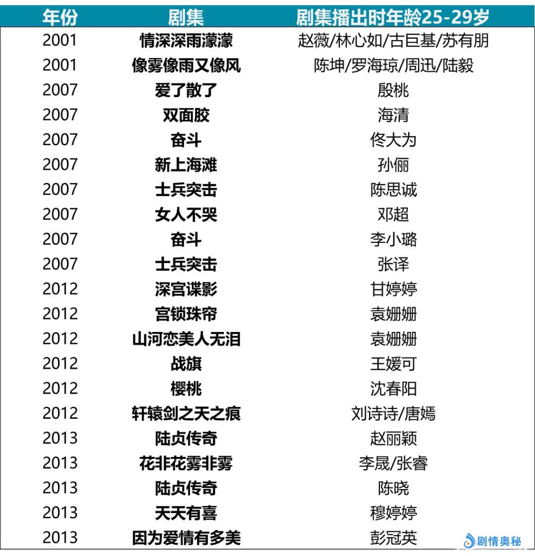 而25-29岁艺人的活跃期主要集中在以下四个年份。2001年,赵薇、林心如、陈坤、陆毅等演员成为扛起收视率的年轻演员代表;2007年,殷桃、海清、佟大为、孙俪、邓超等演员也处于活跃期。2012年,袁姗姗、刘诗诗、唐嫣等演员在高收视率的古装剧里集中出现;2013年赵丽颖、陈晓等演员开始出现在具有较高国民度的电视剧里。