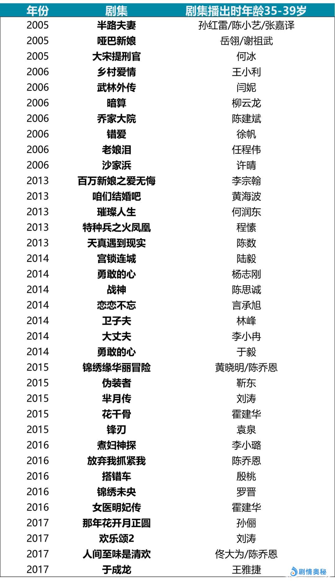 我们粗略统计了在收视率方面表现突出的电视剧里,主演年龄全都40+的作品,以及相关主演信息,如下图所示,在2010年之前,每年都有几部作品由戏骨们挑大梁且获得不错的反响。2010年之后,戏骨们挑起高收视率的年份仅有2015年,2017年以及2018年。