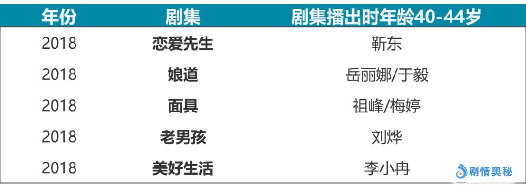 相比之下,40-44岁年龄之间的演员潮比较集中,主要出现在2018年的主流电视剧里,比如靳东、刘烨和李小冉等。