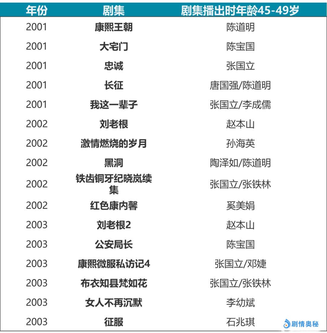 45-49岁艺人的活跃期同样比较有规律,集中出现在2001年至2003年,陈宝国、张国立、李幼斌、唐国强、赵本山、陈道明等演员成为当时电视剧的收视率支柱。