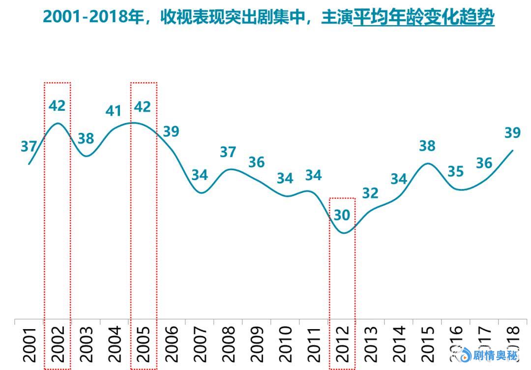 从宏观上来看,具有较高影响力的主流电视剧主演年龄均值一直处于变化中,平均年龄最大的为2002年和2005年的42岁,平均年龄最低的为2012年的30岁。从变化趋势来看,从2005年开始主演趋于年轻化,从2012年开始,年龄又开始回升。