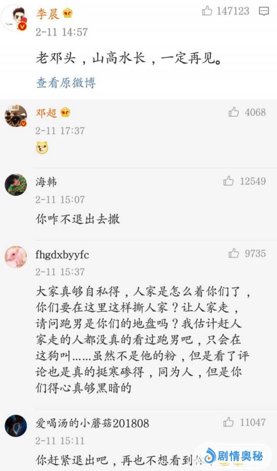 不过,大黑牛李晨就没有那么幸运了,他因为之前的“插刀事件”而崩塌了老实人设,因而网友们也一直不买他的账,这次评论也正好撞在了网友们的枪口上,网友们纷纷把矛头指向他,因此李晨变身靶子受到网友们的疯狂“围攻”。“你咋不退出去撒”、“你赶紧退出吧,再也不想看到你了”、“最不想看到的就是你,你确赖着不走”,总之网友们对于李晨毫不留情面,甚至还有的骂他惺惺作态。