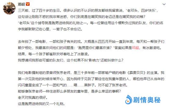 原来,他在去年四月份的时候拍摄了一部和孩子有关的戏,虽说时间已经过去了这么久,但戏的拍摄也只是在近期才完成,而后期还需要他与工作人员的共同努力来完成整部戏的收尾工作……在微博中邓超大多还是表达了自己对《跑男》这档节目以及“伐木累”大家族的不舍之情。邓超的长博一经发出《跑男》节目粉以及邓超的忠实粉纷纷红了眼眶,《跑男》成员李晨也在其微博下方留下感人评论:“老邓头,山高水长,一定再见。”