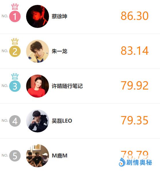 我们首先看到的是艺人势力指数榜单TOP5,目前势力最强大的五位娱乐圈艺人依次是流量明星蔡徐坤、朱一龙、实力派演员许晴、吴磊、鹿晗,其中朱一龙是目前势力最强大的实力派演员,为“小笼包”点赞,紧随其后的实力派演员许晴同样势力不俗,值得一提的是鹿晗此次冲进榜单,这也是小鹿年后首度进前五。