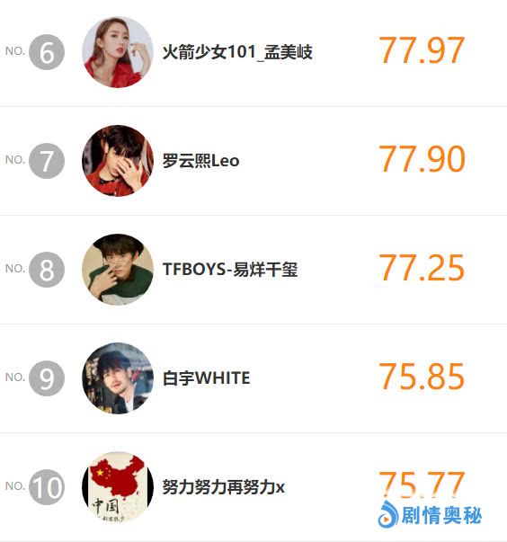 艺人指数排在第6~第10位的娱乐圈艺人依次是孟美岐、罗云熙、TFBOYS易烊千玺、白宇,以及张艺兴,其中安心拍戏的罗云熙升至第七,白宇张艺兴排名全部上升。