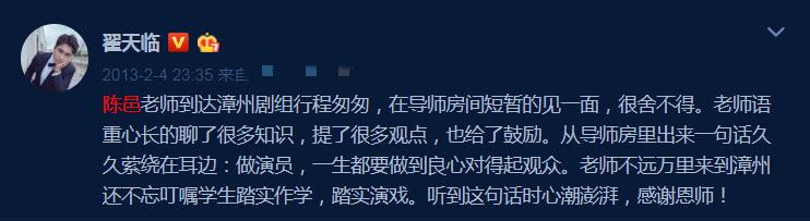 从社交媒体查询,2013年翟天临发布过一条动态,说:陈邑老师到达漳州剧组行程匆匆,在导师房间短暂的见一面,很舍不得。”从这可以看出,翟天临对老师的名字从未认真了解过!