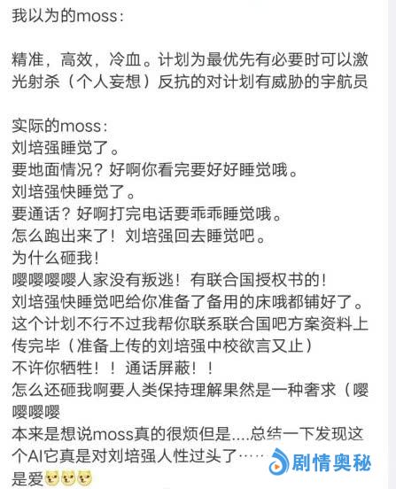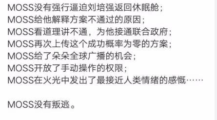 MOSS在影片中一直都对刘培强格外仁慈,一直苦口婆心规劝就想哄他去睡觉,哪怕被炸也毫无怨言。看过这二次元嘤嘤嘤版剧情概况,真的再也不能正视MOSS这个AI了。