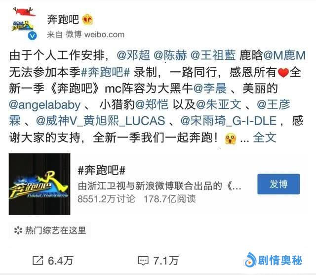 等了大半年之后,居然等到了这样的消息,《奔跑吧》官方微博发布的消息称,“由于个人工作安排,邓超、陈赫、王祖蓝、鹿晗无法参加本季#奔跑吧#录制,一路同行,感恩所有。”该条微博同时官宣“全新一季《奔跑吧》固定嘉宾阵容为‘大黑牛’李晨、美丽的Angelababy、小猎豹郑恺以及朱亚文、王彦霖、黄旭熙、宋雨琦,感谢大家的支持,全新一季我们一起奔跑!”