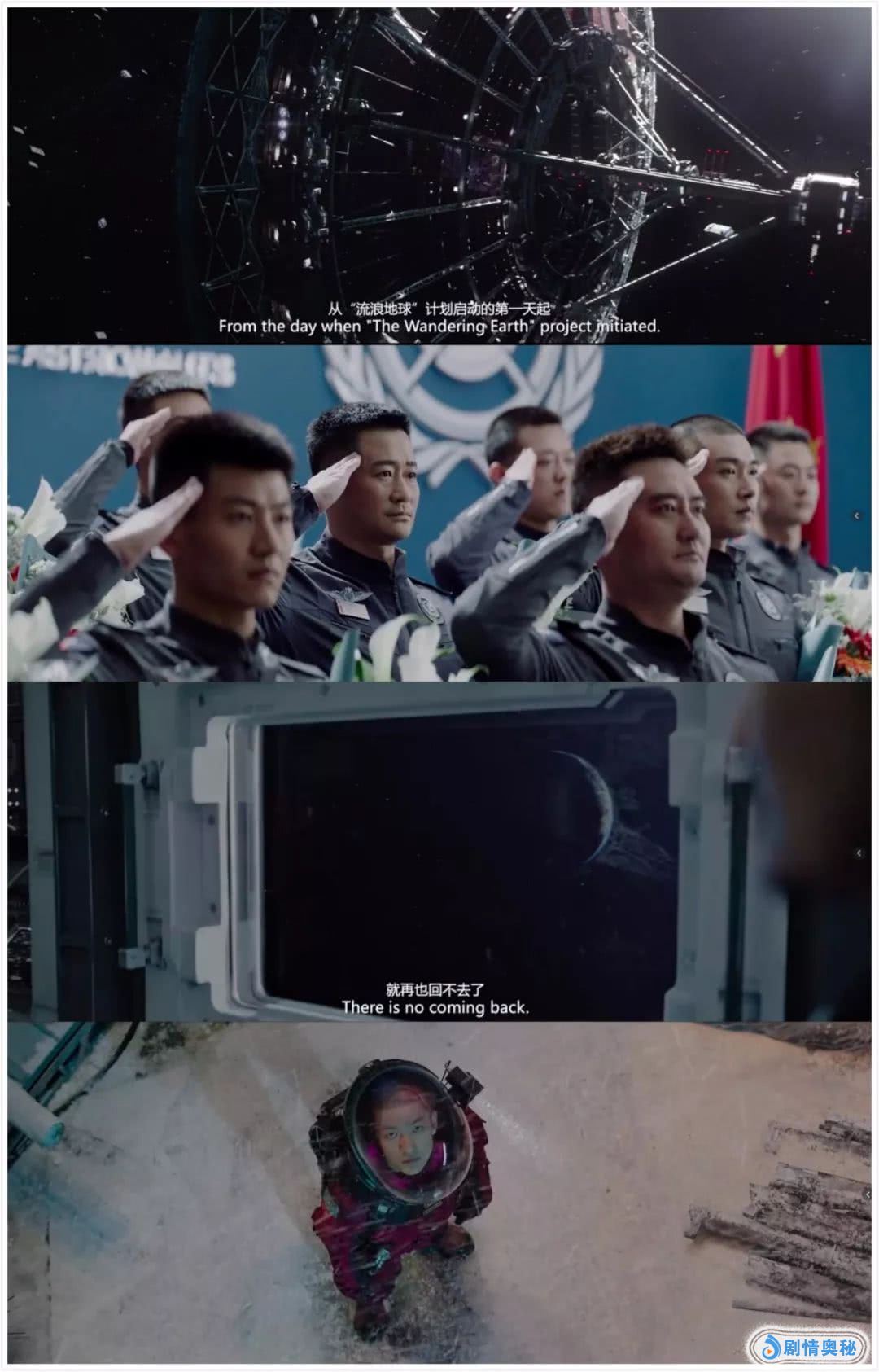 影片开篇,北京地下城的居民正在喜迎中国农历新年,刘启(屈楚萧 饰)和韩朵朵(赵今麦饰)趁机逃出地下城,前往地面冒险。整个故事核心其实是“回家”:一是指刘启与韩朵朵从气候恶劣的冰原重返地下城,二是吴京饰演的航天员刘培强渴望重返地球,弥补对儿子刘启的父爱,三是人类带着地球重新寻找适合生存的家园。