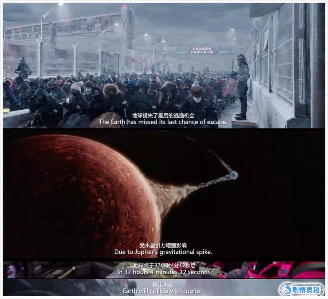 “太阳浩劫”的故事足够恢弘,尤其是地球殉道者们最后的献祭也足够壮丽,但是这背后对人类“永远保持理智确实是一个奢求”的嘲讽、人类非理性引发的互相残杀很难过审。而且“太阳浩劫”基本上也体现不出人类在灾难面前的主观能动性,想必这也不是主创最想做出的表达。于是,“地木相撞”就成了这部电影的核心危机事件。