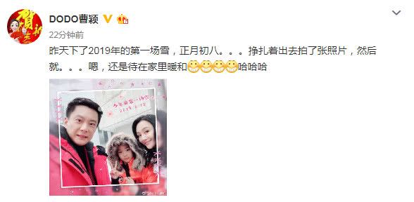 今日(2月13日),凭借《乌龙闯情关》中“霍水仙”一角而被众人所熟知的曹颖,她也在微博晒出和老公王斑以及8岁儿子一起看雪的照片,并附文表示:“昨天下了2019年的第一场雪,正月初八。。。挣扎着出去拍了张照片,然后就。。。嗯,还是待在家里暖和”。