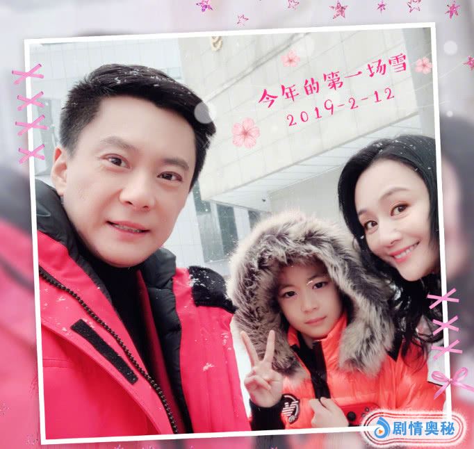 在曹颖晒出的照片中,47岁老公王斑身着红色棉服,头上、衣服上沾上了一些雪花,一旁8岁儿子王梓涵和爸爸一样穿着喜庆的红色棉服,戴着毛茸茸的帽子,站在父母中间对着镜头比出剪刀手的他也十分帅气可爱,而站在最后的曹颖则披散着一头长发,俏皮的露出小脑袋,一起在雪中拍照的一家三口也是超幸福了。