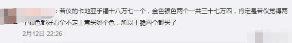 其中,有网友便留言评论:“若仪的卡地亚手镯十八万七一个,金色银色两个一共三十七万四,肯定是若仪觉得两个颜色都好看拿不定主意买哪个,所以干脆两个都买了。”