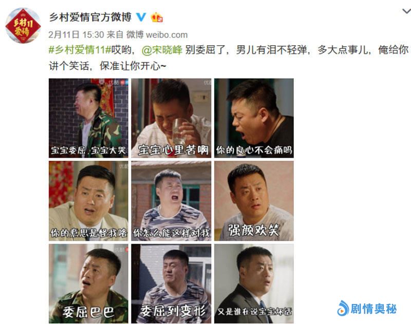 也许是为了安慰乡迷们内心的焦虑,《乡村爱情11》官方媒体平台整理了一组宋晓峰的表情包,来调节一下大家的心情。
