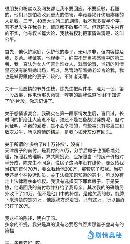 1月12日凌晨,何雯娜在社交平台发长文回应陈一冰,证实陈一冰现在的妻子并非第三者,但当初确实有一段感情节外生枝,陈一冰还曾在电话中说“你终于知道了”,而关于感情求复合自己确实盲目过。何雯娜也否认拿了“N十万”补偿,称只是收下自己出的70万房屋首付款以及陈一冰欠她的款项。