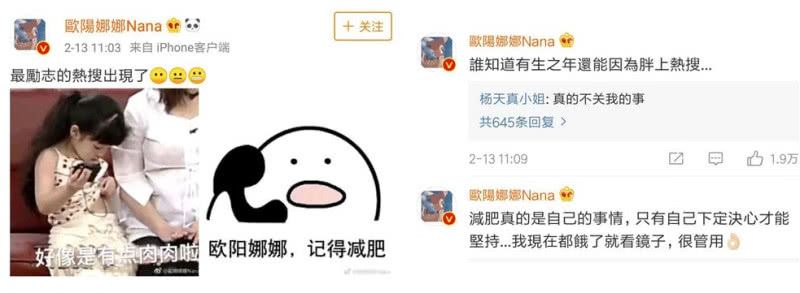 欧阳娜娜在微博上专门回应了长胖的事情,而且还晒出了两张表情包图片自侃,其中一张就是小时候的欧阳娜娜在看自己的小肚子,配上“好像是有点肉肉啦”,真的是不能再可爱了。这个热搜对欧阳娜娜而言真的是最励志的话题了,永远在减肥的道路上。