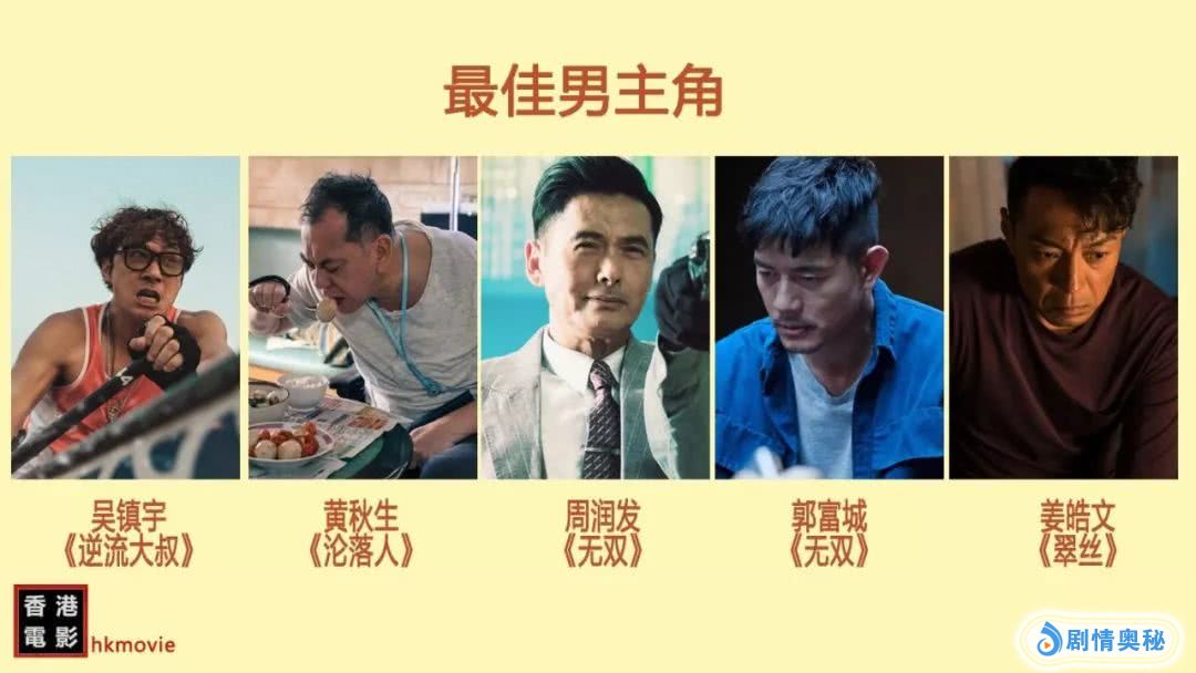 周润发是三届金像奖最佳男主得主,本次入围金像奖距离他上次提名这一奖项,已经过去了8年,距离他上次获奖,已经过去了19年。黄秋生曾两次获得金像奖最佳男主角,郭富城在三年前凭借《踏血寻梅》拿到了最佳男主,这是吴镇宇第六次入围金像奖最佳男主角。姜皓文在去年的金像奖中凭借《拆弹专家》获得最佳男配角。