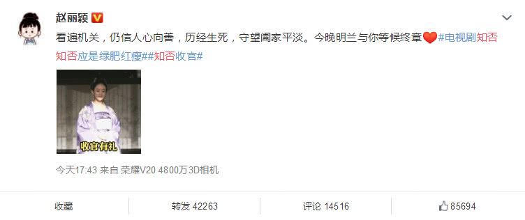 《知否》今晚就要收官虽然小编有些不舍得,不过小编还是期待赵丽颖的下一个角色,等候赵丽颖的回归。“盛明兰”这个角色让赵丽颖突破了自我,不知道赵丽颖以后还会不会继续接类似“知否”的宅斗剧,不过只要赵丽颖出演的作品,都是精品!期待下一部作品!