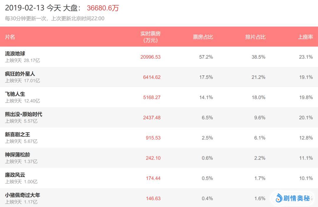 其中,由郭帆执导,吴京特别出演,屈楚萧、李光洁、吴孟达等主演的《流浪地球》单日票房再破2亿,上映9天累计票房已经来到28.17亿,成为这个春节档最大的赢家,而且以目前这部电影的热度,估计还能持续几个星期!