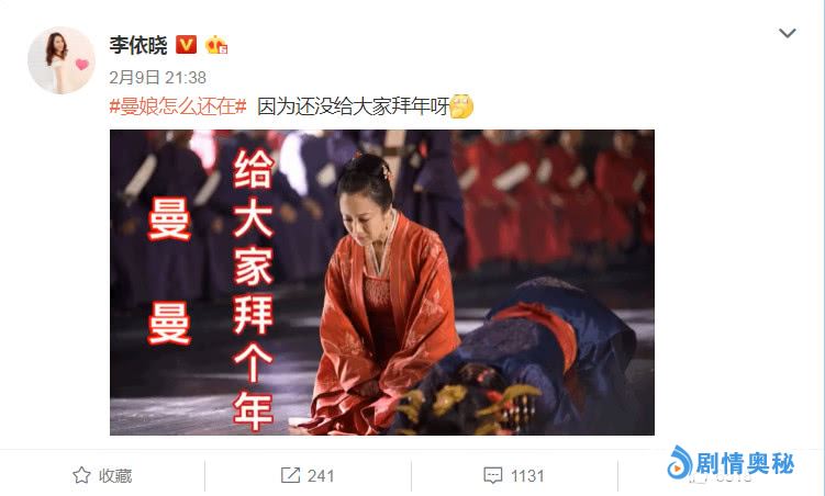 知道观众对“曼娘”这个角色恨之入骨的扮演者李依晓,反而因为一条微博而让观众笑翻了,很多的网友在问问什么曼娘还在的时候,李依晓还用幽默的语调,亲自发文打趣,说自己还在是因为还没有给大家拜年,这样的演员怎么能让人不喜欢呢?
