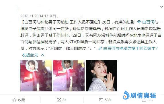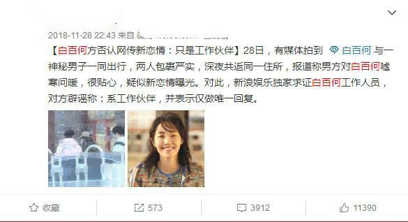 2018年11月28日,有媒体曝光了白百何的新恋情,记者向白百何工作室求证被否认,29日晚上,白百何就被拍到和一位神秘男子到KTV唱歌,然后一起回家。