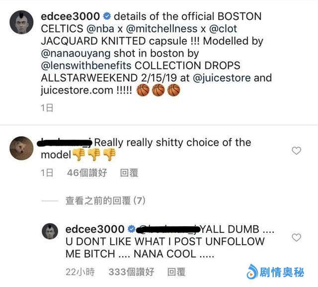 好事值得庆祝与骄傲,只是没想到也是因此又闹出了一段风波,事情本与陈冠希无直接关系,但是容易暴怒的陈冠希还是成为了点燃导火索的关键。在CLOT与Mitchell & Ness、NBA合作确定会推出联名球衣之后,陈冠希找来欧阳娜娜做联名品牌模特,并顺势在社交平台上PO出了欧阳娜娜身着绿色球衣的照片,不知道是拍摄角度不好,还是欧阳娜娜略显发福,她露出的手臂就显得肉肉的,继而遭到网友的热议,更有网友指出模特太差了,这下子就触动了陈冠希的神经,于是他又再一次与网友在网上开仗为欧阳娜娜站队。