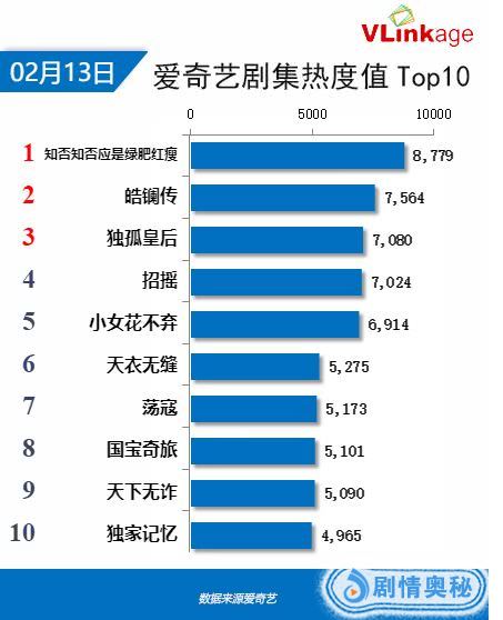【剧集热度榜】 02月13日当日#爱奇艺剧集热度榜#: 1.#知否知否应是绿肥红瘦# 热度值8,779 2.#皓镧传# 3.#独孤皇后# 4.#招摇# 5.#小女花不弃# 6.#天衣无缝# 7.#荡寇# 8.#国宝奇旅# 9.#天下无诈# 10.#独家记忆#