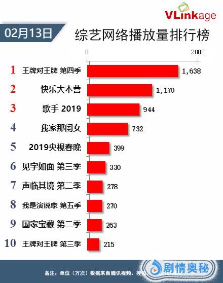 【综艺榜单】 02月13日当日#综艺播放排行榜#: 1.#王牌对王牌 第四季# 日播放1,637万 2.#快乐大本营# 3.#歌手 2019# 4.#我家那闺女# 5.#2019央视春晚# 6.#见字如面 第三季# 7.#声临其境 第二季# 8.#我是演说家 第五季# 9.#国家宝藏 第二季# 10.#王牌对王牌 第三季#