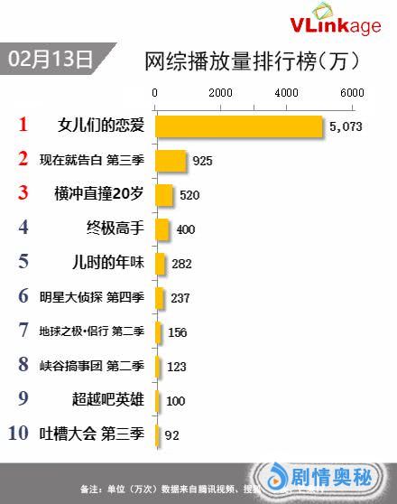 【网综榜单】 02月13日当日#网综播放排行榜#: 1.#女儿们的恋爱# 日播放5,072万 2.#现在就告白 第三季# 3.#横冲直撞20岁# 4.#终极高手# 5.#儿时的年味# 6.#明星大侦探 第四季# 7.#地球之极·侣行 第二季# 8.#峡谷搞事团 第二季# 9.#超越吧英雄# 10.#吐槽大会 第三季#