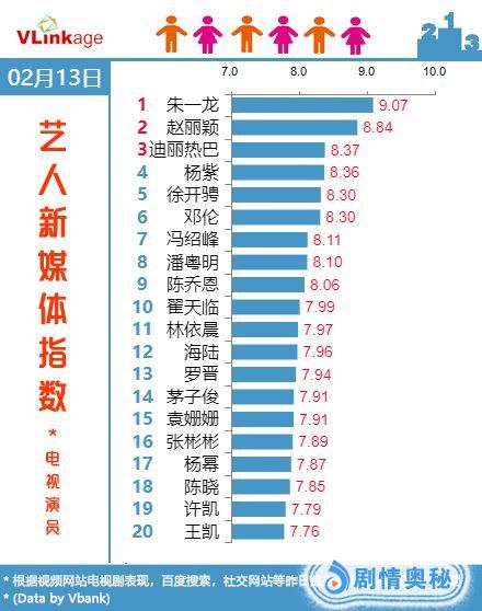 【寻艺指数】 02月13日 #艺人新媒体指数# (电视剧演员)Top 20榜单: #朱一龙#, #赵丽颖#, #迪丽热巴#, 排名前3位, #杨紫#, #徐开骋#, #邓伦#, 分列4、5、6位.