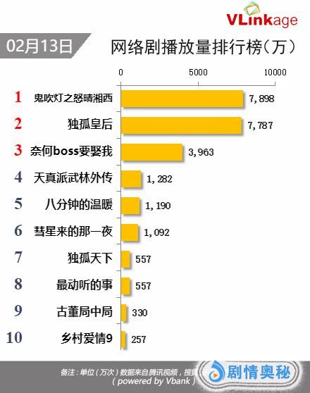 【网络剧榜单】 02月13日当日#网剧播放排行榜#: 1.#鬼吹灯之怒晴湘西# 日播放7,897万 2.#独孤皇后# 3.#奈何boss要娶我# 4.#天真派武林外传# 5.#八分钟的温暖# 6.#彗星来的那一夜# 7.#独孤天下# 8.#最动听的事# 9.#古董局中局# 10.#乡村爱情9#