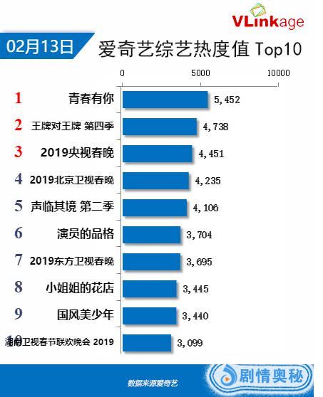 【综艺热度榜】 02月13日当日#爱奇艺综艺热度榜#: 1.#青春有你# 热度值5,452 2.#王牌对王牌 第四季# 3.#2019央视春晚# 4.#2019北京卫视春晚# 5.#声临其境 第二季# 6.#演员的品格# 7.#2019东方卫视春晚# 8.#小姐姐的花店# 9.#国风美少年# 10.#湖南卫视春节联欢晚会 2019#