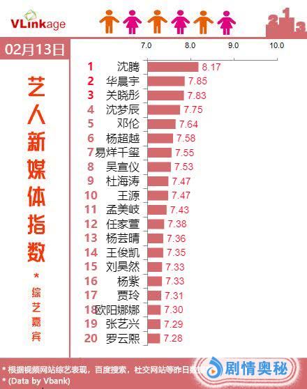 【寻艺指数】 02月13日 #艺人新媒体指数# (综艺嘉宾)Top 20榜单: #沈腾#, #华晨宇#, #关晓彤#, 排名前3位, #沈梦辰#, #邓伦#, #杨超越#, 分列4、5、6位.